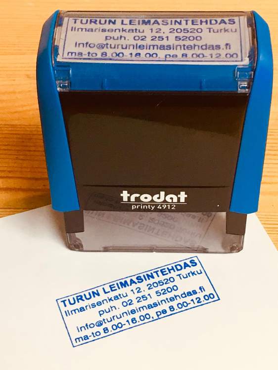 Laadukkaat itävaltalaiset Trodat Printy- ja Trodat Professional -tekstileimasimet asiakkaan aineiston mukaisella tekstillä ja logolla.